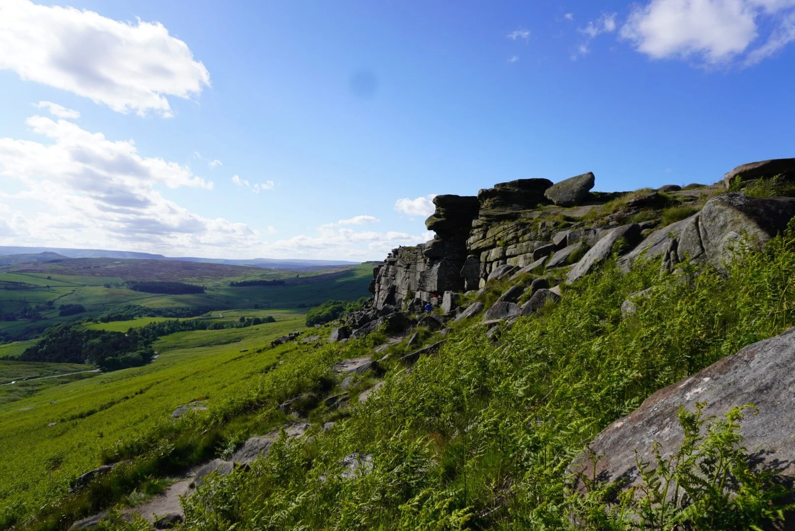 The route follows well-made paths up and out of the village, past the church, through beech woodlands, and up over the tops towards Stanage Edge, before meadnering back down into the village on country lanes.